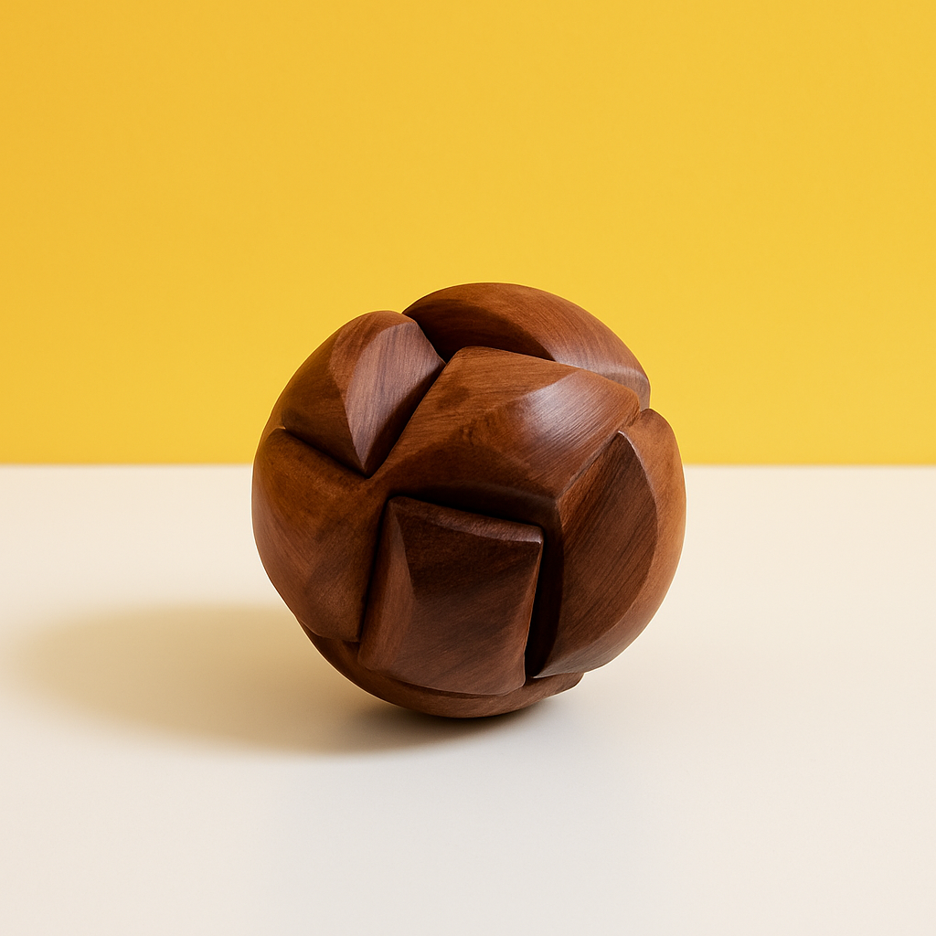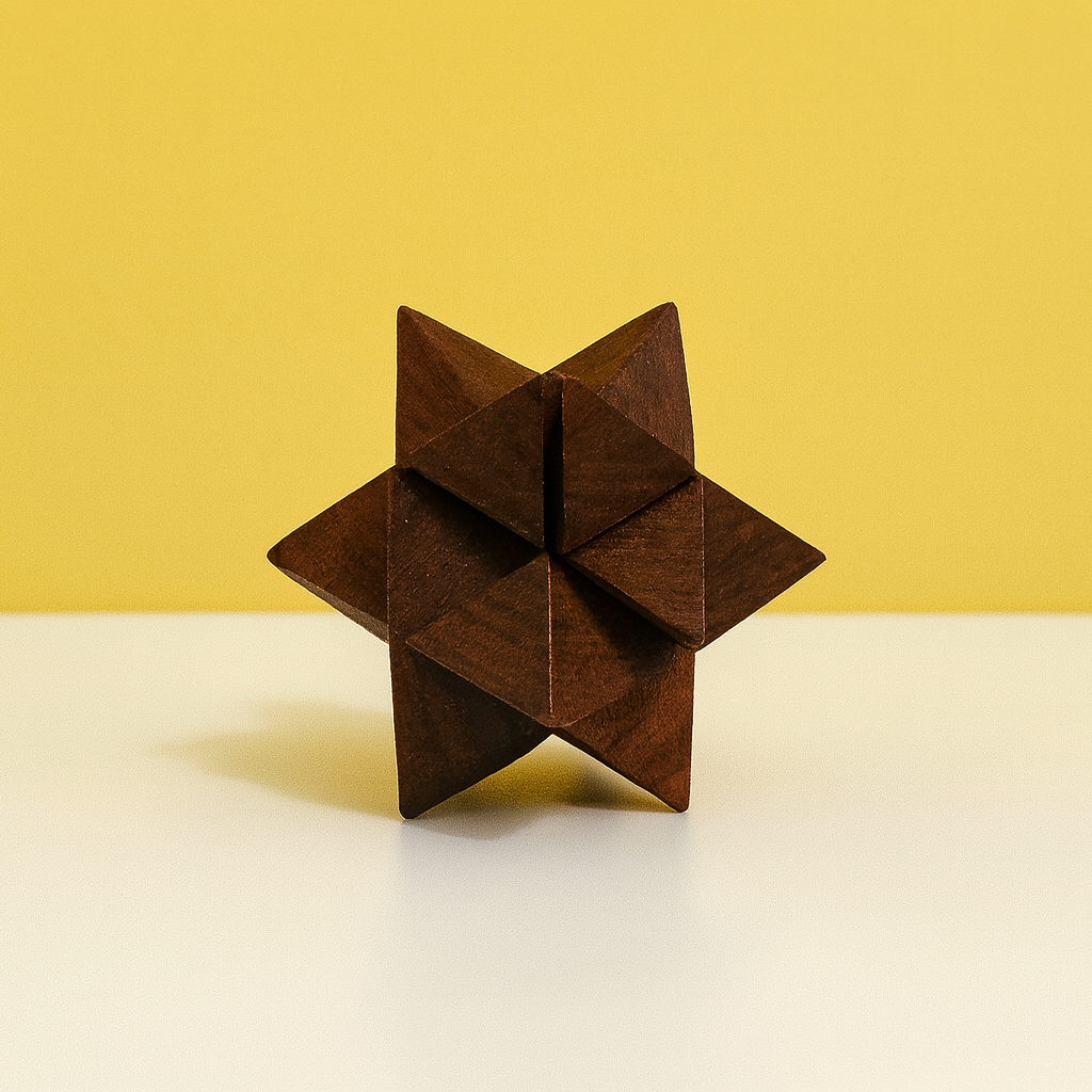 6 unique wooden puzzles – star, cube, sphere, and more