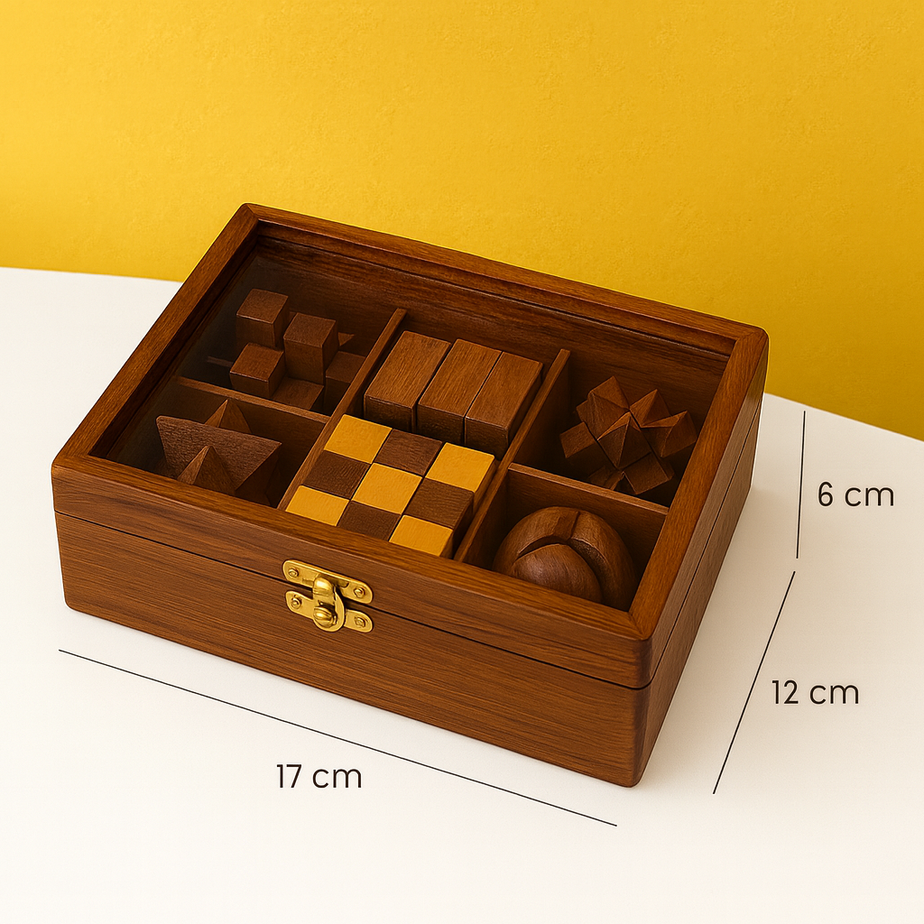 Unlock the joy of problem-solving with this beautifully handcrafted 6-in-1 Wooden Puzzle Box. Made from premium quality wood, this set is designed to challenge your mind, boost focus, and provide hours of entertainment for kids and adults alike.
