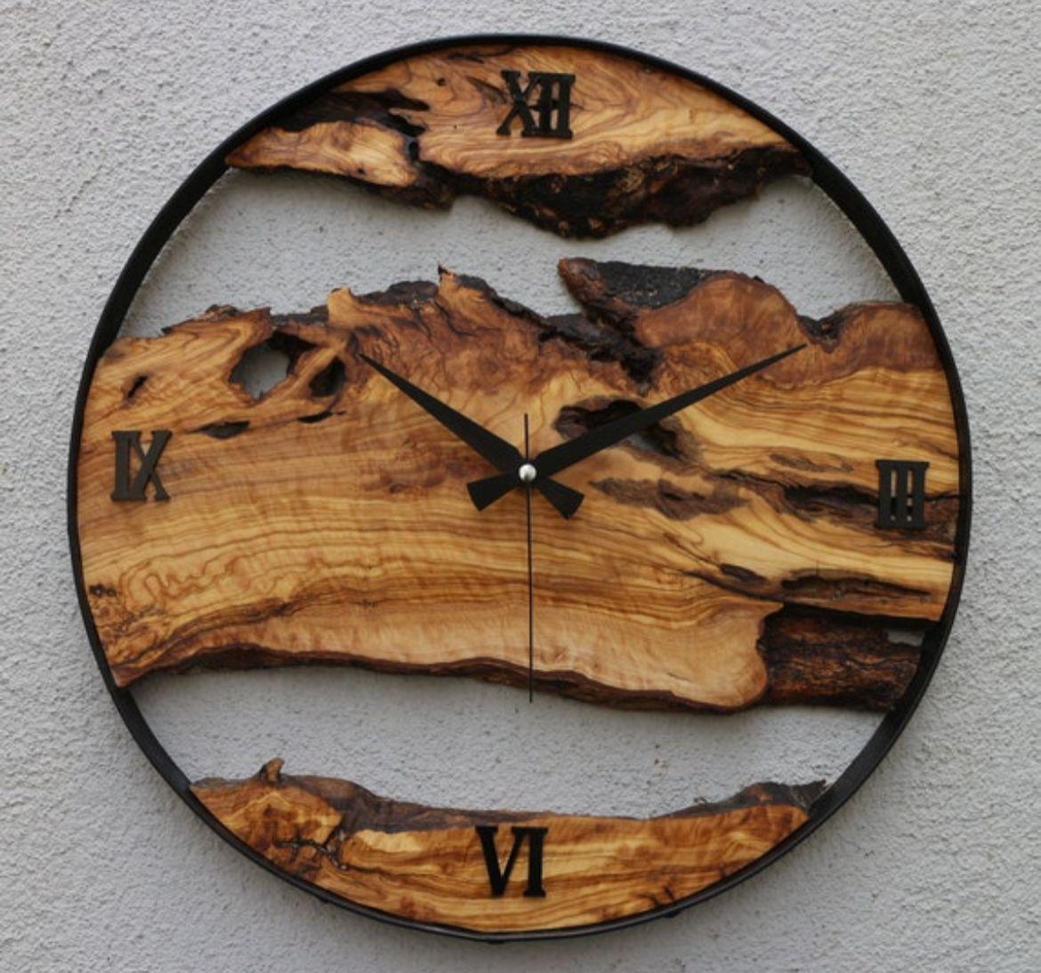 Each clock features naturally contoured live-edge wood, highlighting the raw beauty of grain, knots, and bark. No two clocks are the same — each is a one-of-a-kind masterpiece.